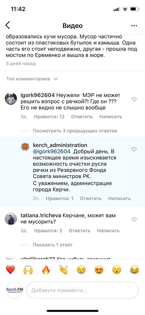 После публикации  Керчь.ФМ в соцсетях о мусоре в речке Мелек-Чесме, администрация города со своего аккаунта ответила керчанам.