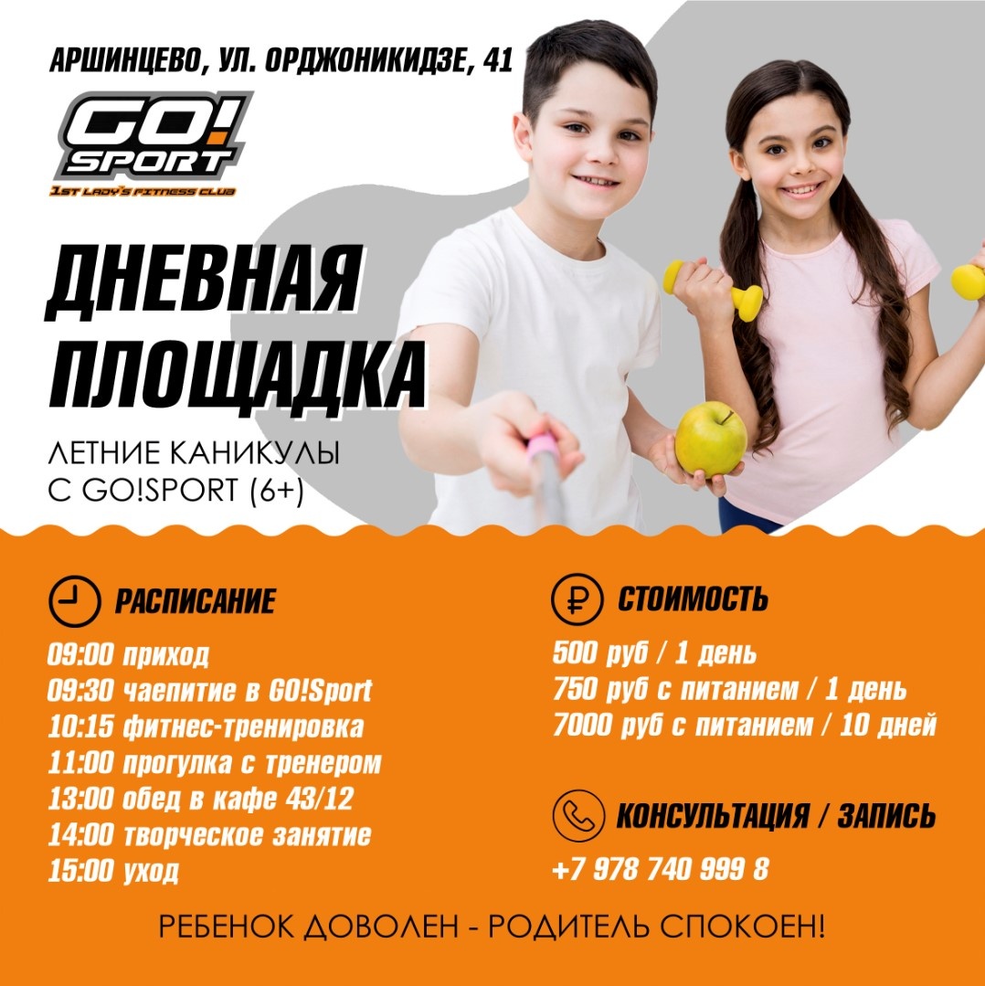 На время летних каникул фитнес-клуб организовывает детскую досугово-развлекательную программу. Дневная площадка от GO!Sport — это прекрасная возможность для Ваших детей провести летние каникулы в городе с максимальной пользой для физического и эмоционального здоровья.