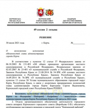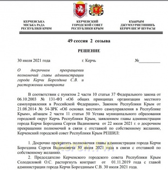 Председателю Керченского городского совета Республики Крым Солодиловой О.С. расторгнуть контракт от 01.11.2019 года с главой администрации города Керчи Бороздиным С.В. 30 июля 2021 года», - указано в принятом решении.