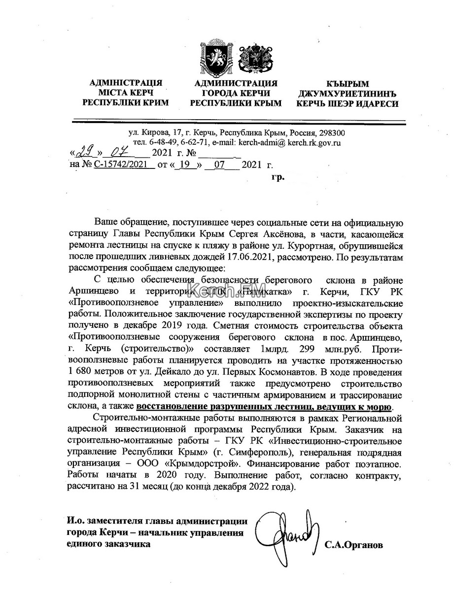 После публикации на сайте Керчь.ФМ «До рухнувшей в Аршинцево лестницы никому нет дела» в редакцию обратился неравнодушный керчанин, которому есть дело. Он рассказал, что обращался к властям и даже получил отписку, где пообещали ремонт рухнувших лестниц, но каких конкретно не указали.