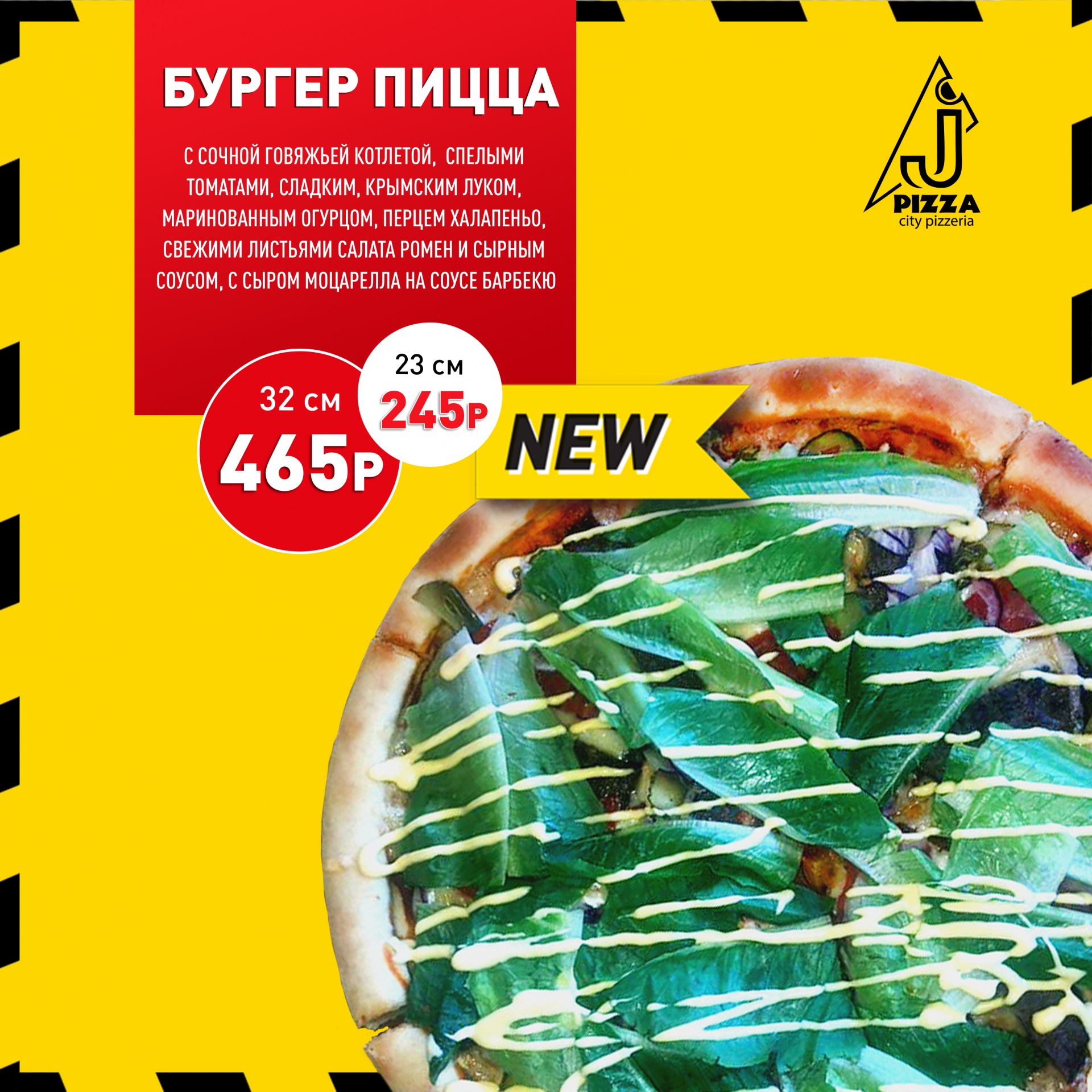 «Бургер пиццу» с сочной говяжьей котлетой, спелыми томатами, сладким крымским луком, маринованным огурцом, перцем халапеньо, свежим листом салата ромен и сырным соусом, сыром моцарелла на соусе барбекю.