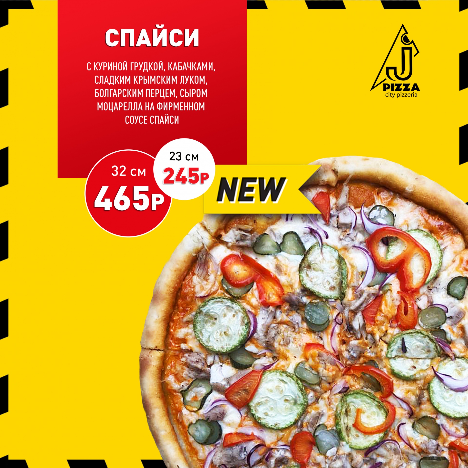 Пиццу «Спайси» с куриной грудкой, кабачками, сладким крымским луком, маринованными огурцами, болгарским перцем, сыром моцарелла на фирменном спайси соусе.