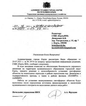 "В ходе заседания комиссии по обеспечению безопасности дорожного движения на территории муниципального образования городской округ Керчь, принято решение о целесообразности установки светофорных объектов на пешеходных переходах в районе пересечения пер.Дмитрова и Адмиралтейского проезда, а также в районе филиаола "ЮгНИРО" - АзНИИРХ.