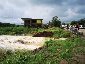 Во время усиления дождя вода переливается через мост по улицам Центральная-Боровикова в деревне Войкова. Таким образом, можно представить с какой силой прибывает вода в район улицы Полевая, Глухова, переулок Вокзальный, 1 горбольница.
