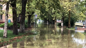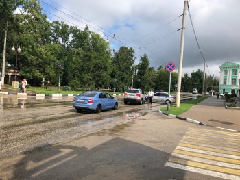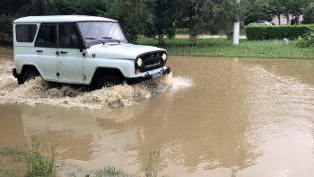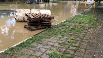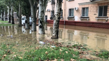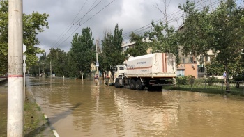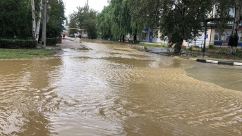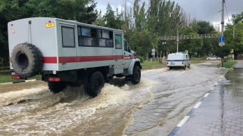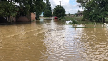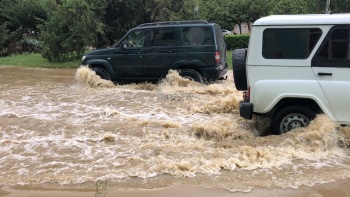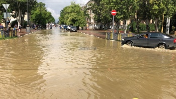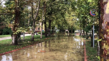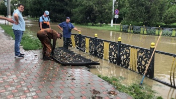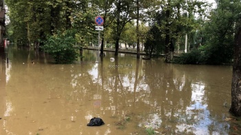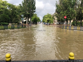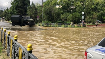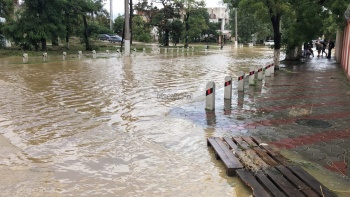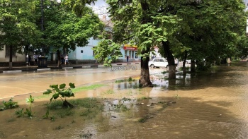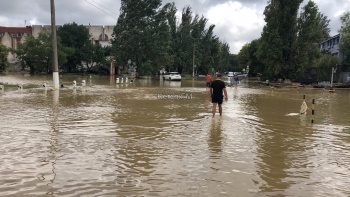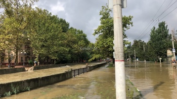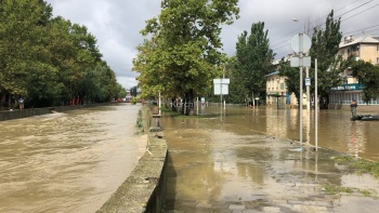Улица Еременко, Борзенко затоплены. Речка не вышла из берегов в этом месте, уходит поток в море. Дежурят МЧС на лодке. Затоплена Борзенко и Пролетарская. Советская от перекрестка с Циолковского перекрыта.