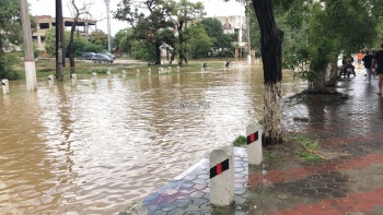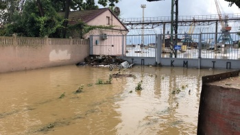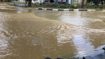 Так, дорога от СРЗ перекрыта. Проезжая часть у исполкома затоплена, легковой автомобиль не пройдет. Рабочие чистят левнёвки, говорят, что с утра здесь столько воды не было. У торгового порта вода, по сравнению с ночью, сходит. Но проезд все еще перекрыт. Пройти и не намокнуть не получится - вода суть ниже колена. Здесь и арбузы, которые потоком принесло с оптового рынка.