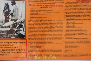 Информационный стенд предупреждает желающих намазать тело свое вонючей жижей озера Чокрак о многочисленных пользах этого занятия, а также о противопоказаниях. Но не предупреждает о том, что смыть эту самую грязь поблизости негде, как и негде переодеться или сходить по нужде в туалет. Эти опции отсутствуют, хотя в прошлые годы заботливые руки мастерили подобие этих удобств, - передает Керчь.ФМ.