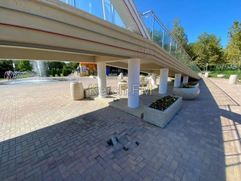 Далее, держа путь к аркам, которые то светятся, то нет, в глаза резко бросается провалившаяся несколько недель назад тротуарная плитка. Под копией Крымского моста плитка тоже провалилась, но главное, что мост стоит.