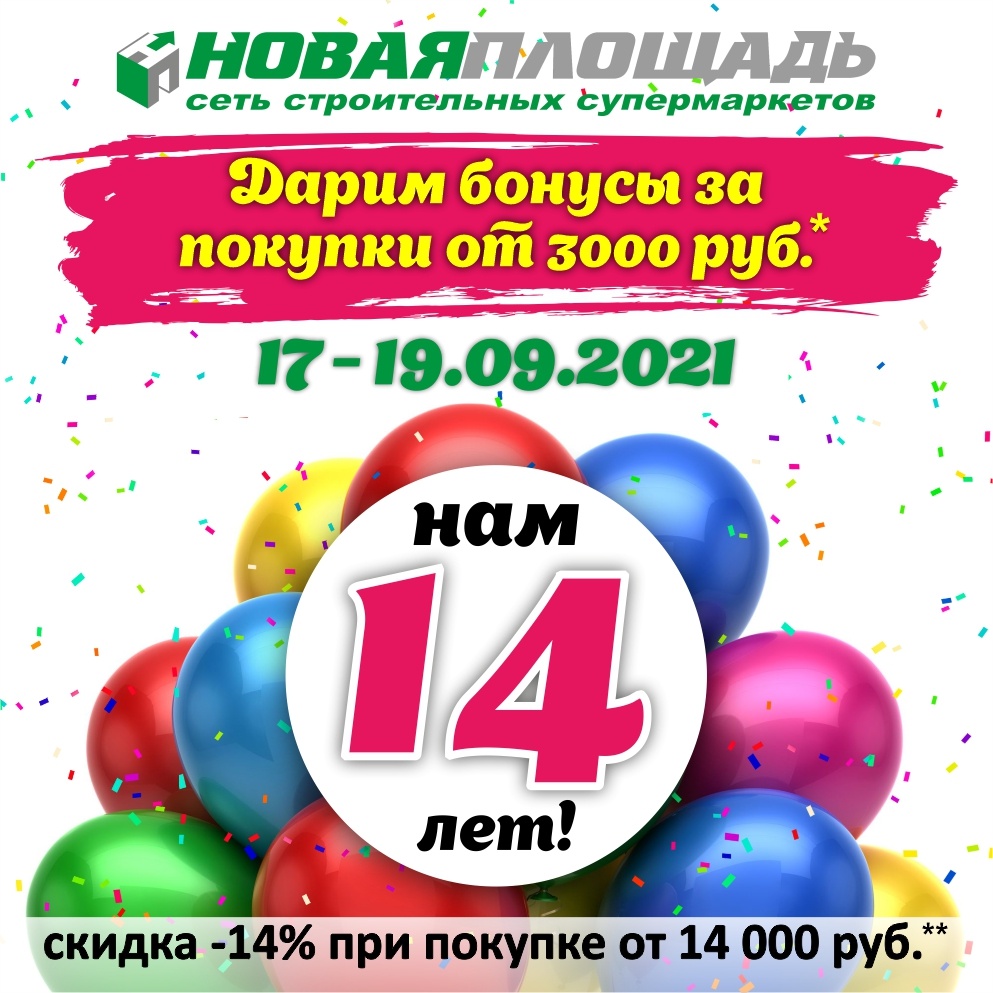 С 17 по 19 сентября 2021 года мы отмечаем День Рождения Новой Площади — 14 лет магазину, который радует нас своими постоянными скидками, акциями, и выгодными предложениями. Большие скидки в честь дня рождения позволят вам обзавестись нужными и полезными товарами для ремонта и дома, создать уют и навести красоту.