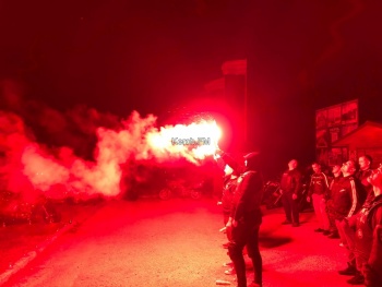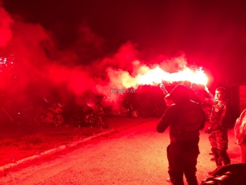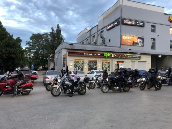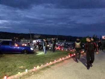 Из центра города колонна отправилась на выезд из Керчи к стелле. Мотоциклисты зажгли свечи, пустили ракетницы в небо и почтили погибших мотоциклистов минутой молчания.