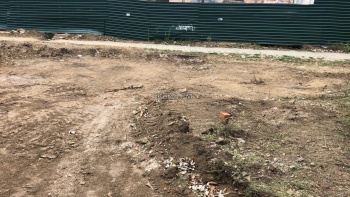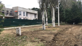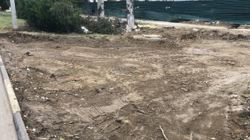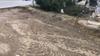 Работы здесь начали еще на прошлой неделе. Рабочие сняли слой грунта в двух местах, убрали некоторые деревья. Один из участков будущего заезда находится прямо посреди нового здания, видимо здесь будет центральный вход в сад. Бордюры пока не убрали.