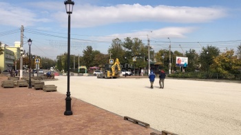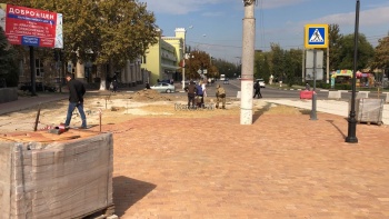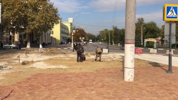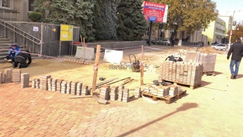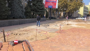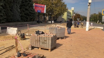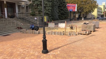 Отметим, также идут работы по восстановлению пешеходной дорожки к административному зданию. Здесь укладывают новую плитку. Дорожку для слепых, которую сделали здесь примерно год назад, пока убрали.