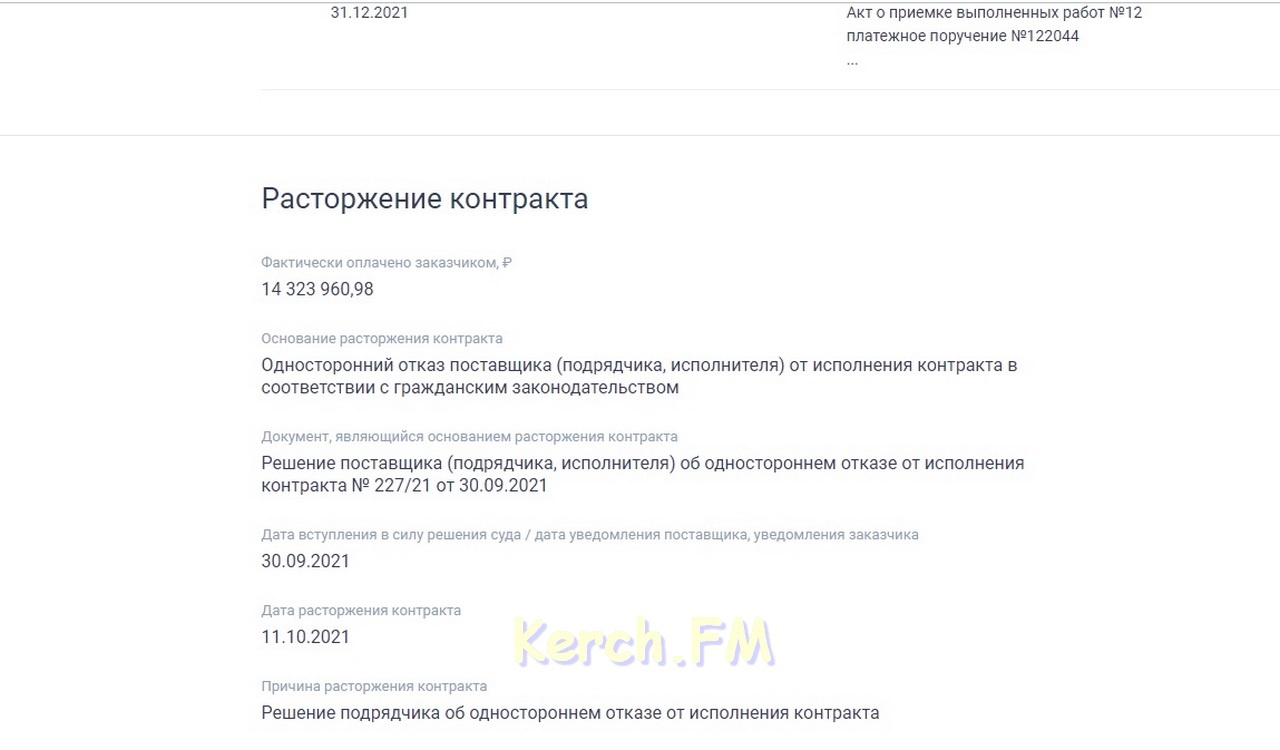 Действительно, на сайте Госзакупок, размещена информация о расторжении контракта. Однако по всем дворовым территориям, благоустраиваемым в 2021 году, расторг контракты ООО "Луксар", а не заказчик УЖКХ Керчи. Основанием для расторжения контрактов указано непредоставление заказчиком корректной проектно-сметной документации, несмотря на неоднократные обращения ООО "Луксар" по этому поводу.