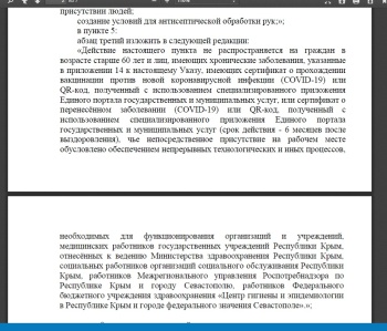 «Также принято решение о скором внесении изменений в указ о режиме повышенной готовности в Республике Крым, в рамках которого учреждения общепита вновь смогут работать в ночное время, при этом, наполняемость залов в театрах и кинотеатрах расширяется с 50% до 70%. Кроме этого, вакцинированным гражданам 60+ будут восстановлены льготы на проезд в общественном транспорте», - писал Аксенов.