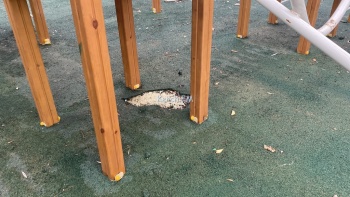 Напомним, напольное покрытие пришло здесь в негодность спустя месяц после открытия площадки. На сегодняшний день уборку на площадке никто не проводит. В песочнице мусор, на площадке и около скамеек тоже.