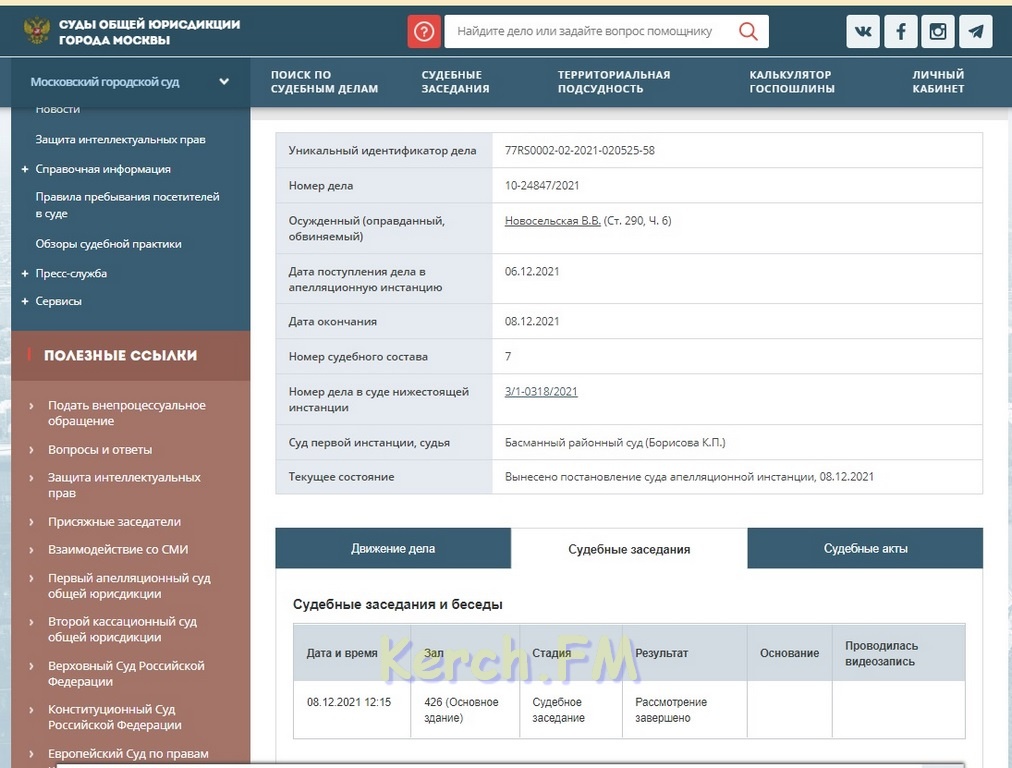 Московский городской суд оставил без изменения решение Басманного суда о содержании под стражей Арины/Веры Новосельской до 17 января. Решение назначенного на сегодня на 12:15 заседания огласили, - передает Керчь.ФМ.