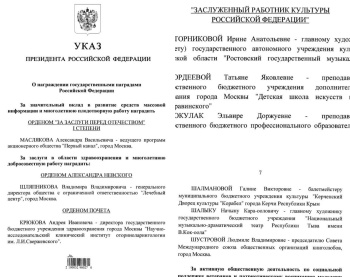 Указом Президента Российской Федерации Почетное звание "Заслуженный работник культуры Российской Федерации" присвоено Галине Викторовне Шалмановой, профессиональному хореографу, балетмейстеру, руководителю «Заслуженного коллектива России шоу-балета «Алиса». Об этом сообщает телеграм-канал «Новости культуры Керчи», - передает Керчь.ФМ.