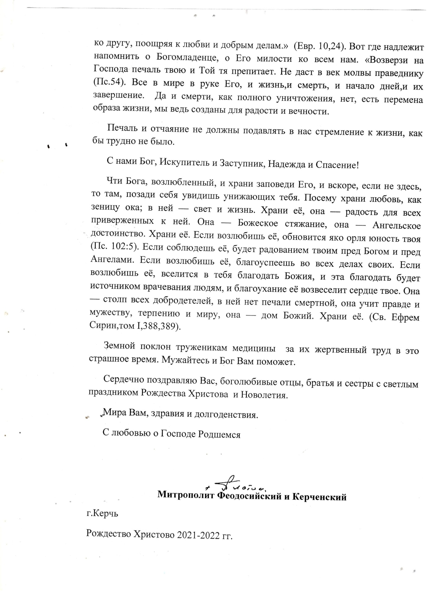 Канцелярия Феодосийской Епархии попросила опубликовать на сайте  Керчь.ФМ Рождественское послание Митрополита Феодосийского и Керченского Платона.