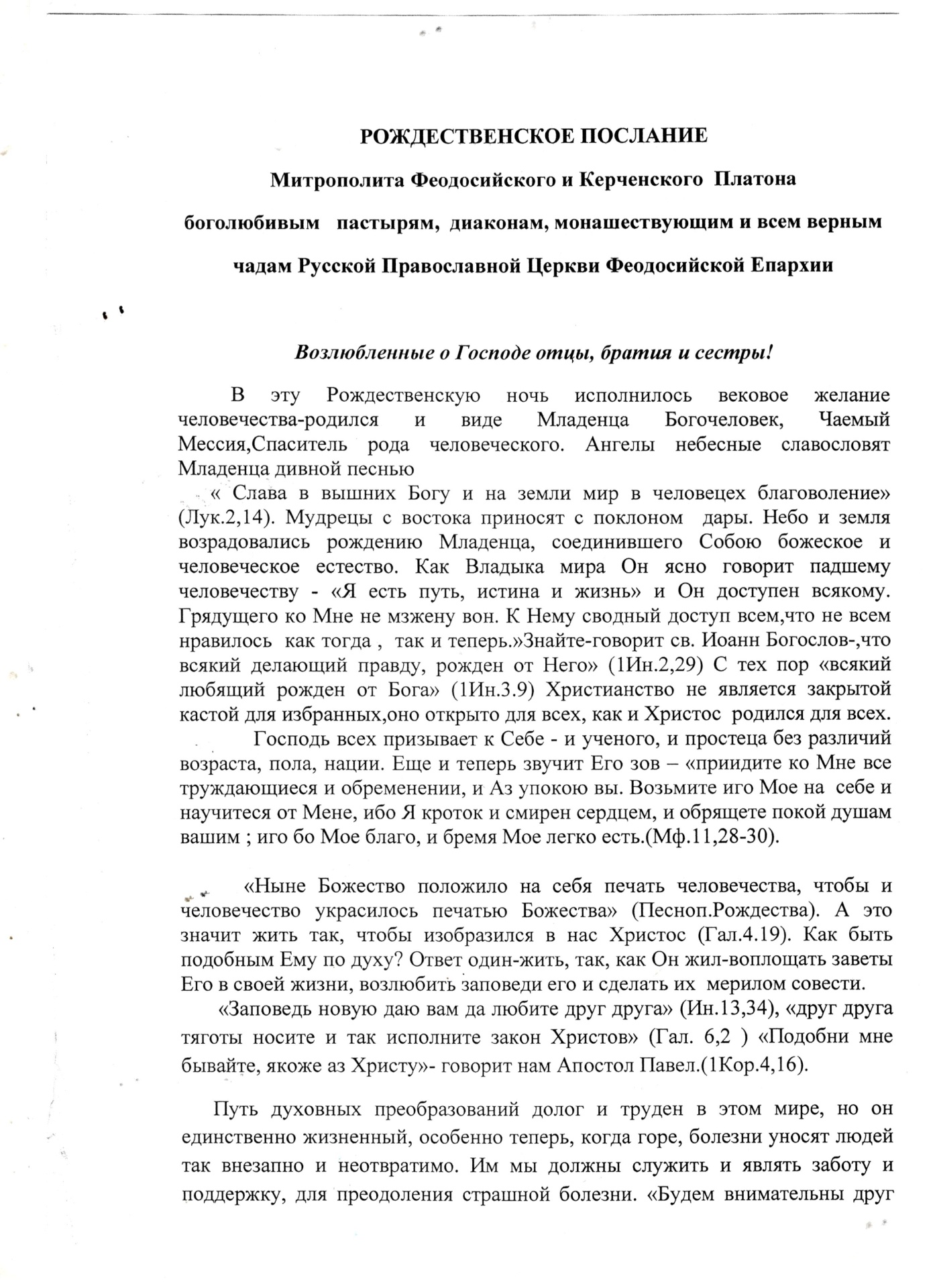Рождественское послание Митрополита Феодосийского и Керченского Платона