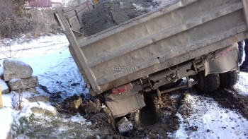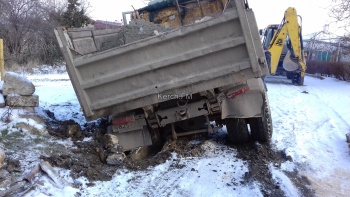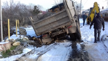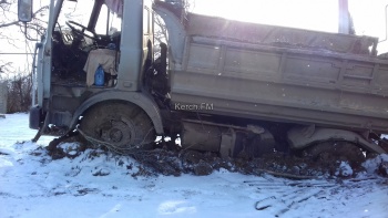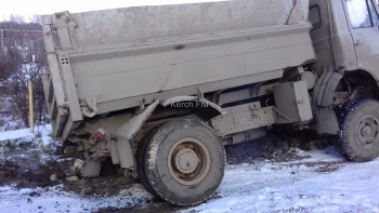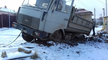 На дороге в частном секторе в Керчи завяз МАЗ, вытащить не могут