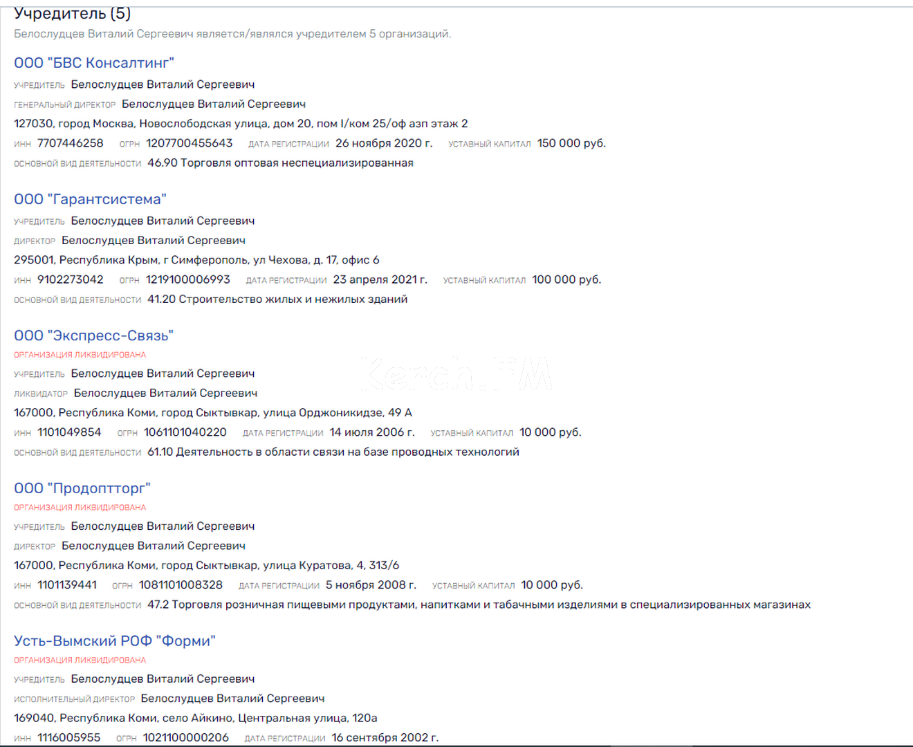До этого Белослудцев был учредителем еще 3 уже ликвидированных предприятий : ООО "Экспресс-Связь", занимавшейся проводными технологиями, ООО "Продоптторг", торговавшей продуктами и Усть-Вымский РОФ "Форми" - эти курировали молодежные инициативы в Коми. Также Белослудцев был дважды предпринимателем. Предпринимательство также закрыто.