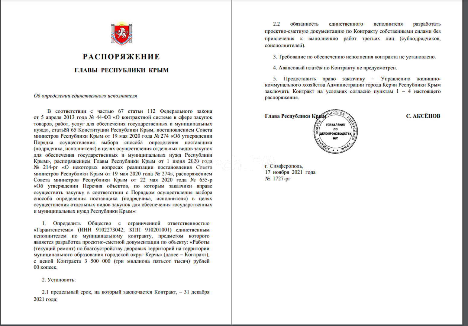 Сергей Аксенов своим Указом от 17 ноября определил ООО «Гарантсистема» единственным поставщиком услуги по разработке проектно-сметной документации по объекту: «Работы (текущий ремонт) по благоустройству дворовых территорий на территории муниципального образования городской округ Керчь» (далее - Контракт), с ценой Контракта 3 500 000 (три миллиона пятьсот тысяч) рублей 00 копеек.