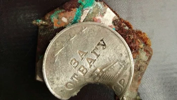 Это оказалась медаль "За отвагу" - согнутая пополам, с вырванным краем. Рядом нашлась также колодка от нее. Как оказалось позже - материя колодки была насквозь пропитана кровью. Поисковики предположили, что осколок снаряда ударил в награду, повредил медаль и, скорее всего, убил или серьезно ранил ее владельца.