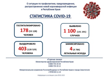 За 9 февраля 2022 года на территории Республики Крым зарегистрировано 1100 случаев новой коронавирусной инфекции, всего выявлено 141 201 положительный на Covid-19. Об этом сообщает пресс-служба Минздрава Крыма, - передает Керчь.ФМ.