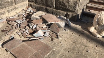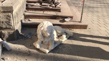Двух львов, «охранявших» вход по бокам, сняли и положили рядом с ремонтными работами. Часть лестницы оградили стулом и сигнальной лентой. Рабочие с помощью перфоратора разбивают гранитную плитку и складывают у основания в кучи. Лишь немного плитки остается целой.