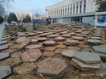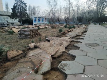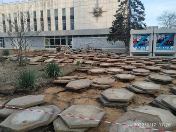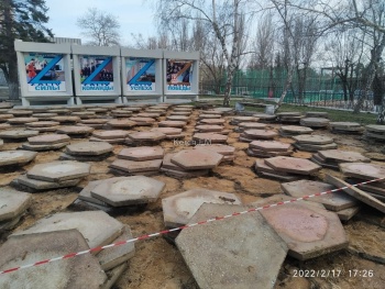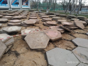 Так, пока оградили территорию у стендов. Там уже сняли большую плитку. Также рабочие снимают и бордюры с клумб.