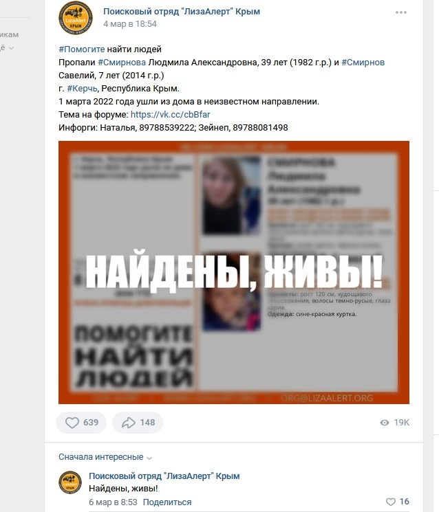 Керчанку Людмилу Смирнову, которая пропала вместе с сыном 1 марта, нашли живыми. Об этом сообщает поисковый отряд «ЛизаАлерт», - передает Керчь.ФМ.