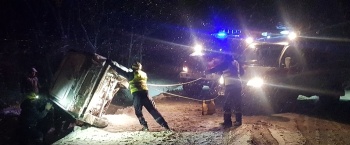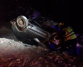 По прибытии, было установлено, что в районе с. Грушевка, водитель а/м Нива, на скользкой дороге, в темное время суток, в сложных погодных условиях, не справился с управлением, съехал на обочину и допустил опрокидывание транспортного средства с переворачиванием на крышу.