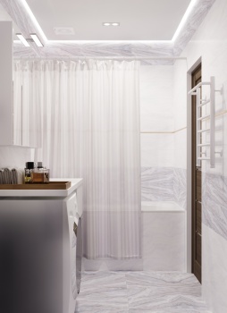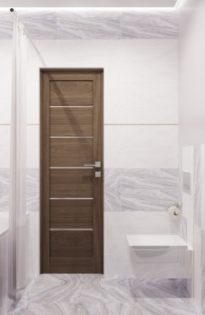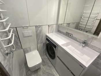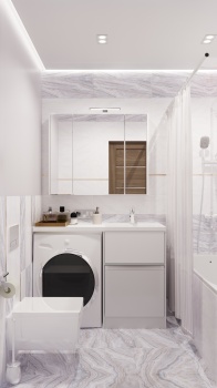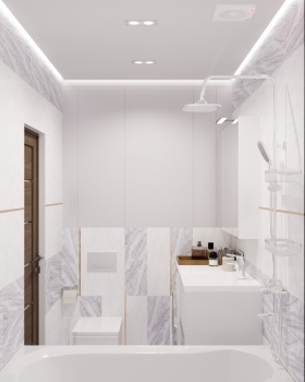 Применили наиболее вместительную расстановку сантехнических приборов и сместили проем для двери под новую планировку. За счет лаконичных декоративных элементов создали нескучный образ.