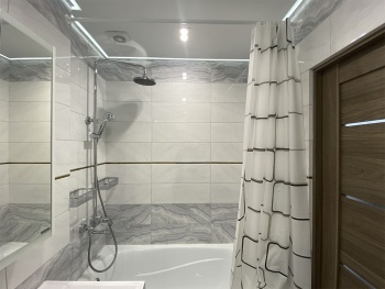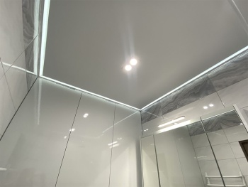 Важную роль играет освещение маленькой ванной комнаты. Оптимальным решением было применение потолка с контурной подсветкой и яркого точечного освещения.