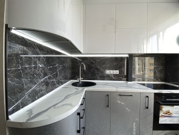 Для решения ключевой задачи по расширению пространства были применены зеркала и многоуровневое освещение, а общий светлый тон керамогранита визуально сделал пространство больше.