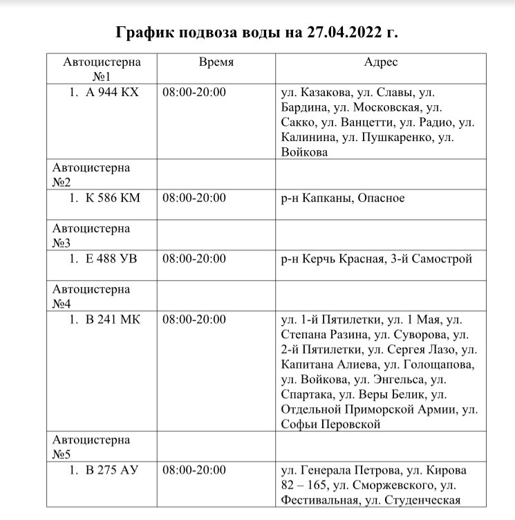 Керченский водоканал сообщает график подвоза воды на 27 апреля, - передает Керчь.ФМ.  Отметим, из-за работ без воды останутся ул. Генерала Петрова, Кирова, Сморжевского, Капканы, Опасное и другие.