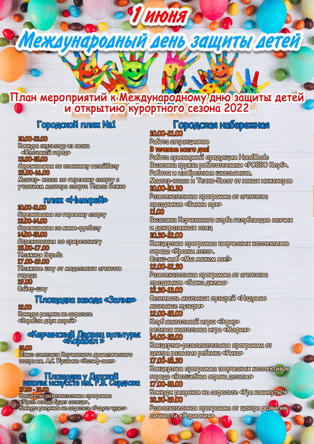 Администрация города Керчи приглашает керчан и гостей города принять участие в мероприятиях, приуроченных ко Дню защиты детей и открытию курортного сезона, - передает Керчь.ФМ.