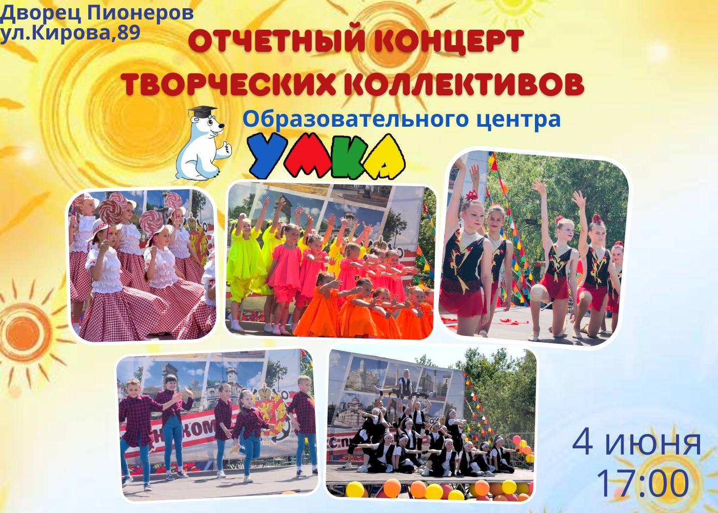В субботу 4 июня в 17:00 во Дворце Пионеров по адресу ул.Кирова, 89 состоится традиционный праздничный отчетный концерт творческих коллективов Образовательного центра «Умка».
