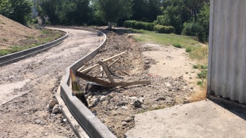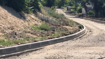 Ранее здесь сняли старый слой асфальта и того, что от него осталось. Установку новых бордюров завершили.