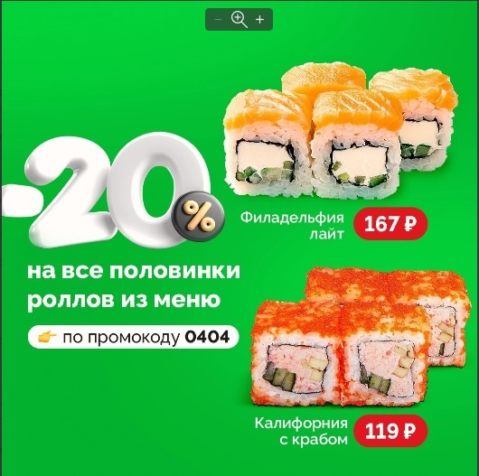 Добавляй в корзину ½ любимых роллов, вводи промокод 0404 и получай скидку 20%! Успей воспользоваться акцией до 31.08.!