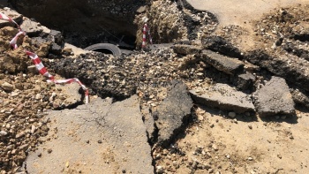 Место порыва раскопали, рядом насыпали кучу земли. С другой стороны никак не оградили провал диаметром в несколько метров. Отметим, этот участок дороги открыт для проезда транспорта
