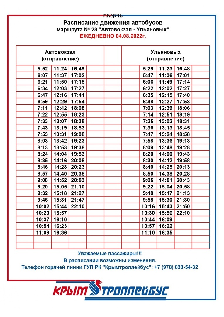 С 4 августа маршрут № 28 "Автовокзал - ул. Ульяновых" будет осуществлять рейсы по новому расписанию. Об этом сообщает пресс-служба администрации Керчи, - передает Керчь.ФМ.