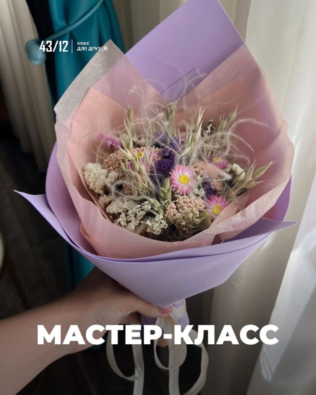 30 августа кафе 43/12 приглашает на творческий мастер-класс по флористике. Под руководством флориста из Special Flowers Kerch соберем с юными участниками милые букеты из сухоцветов, которые можно подарить в День знаний дорогому учителю. Такой подарок будет радовать ни один год!
