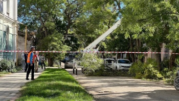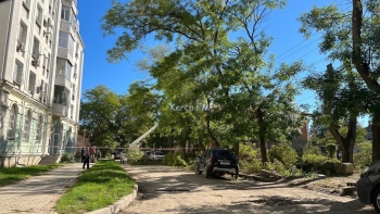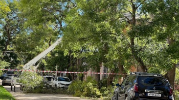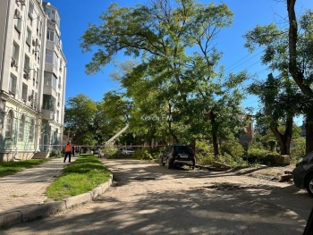 В Керчи днем 7 октября у жилых домов в переулке Сенной пилили высокие деревья, - передает Керчь.ФМ.   Работы вели с помощью автовышки, из-за этого была перекрыта часть дороги.
