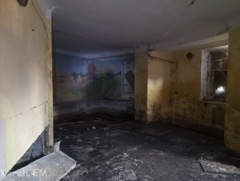 Часть подвала под домом рядом со 2 гимназией занимала раньше пионерская комната. Здесь есть окна на улицу, остались расписанные детскими сюжетами стены. Но неисправная канализация, текущая в подвал годами, разрушила все.
