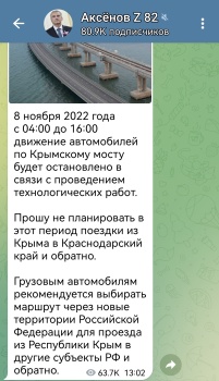Завтра, 8 ноября, движение по Крымскому мосту будет временно остановлено. Мост будет закрыт с 4 утра до 16 дня. Об этом сообщил Глава Крыма Сергей Аксёнов, - передает Керчь.ФМ.