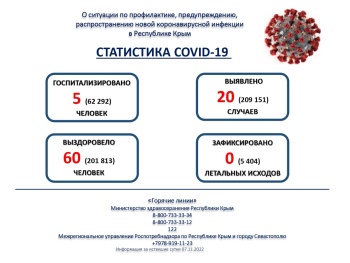 «По данным Межрегионального управления Роспотребнадзора по Республике Крым и городу Севастополю за 7 ноября 2022 года на территории Республики Крым зарегистрировано 20 случаев новой коронавирусной инфекции, всего выявлено 209 151 положительных на Covid-19. За истекшие сутки госпитализировано 5 пациентов, за все время на стационарном лечении находились 62 292 человека. Количество выздоровевших за сутки составляет 60 человек, выздоровевших за весь период - 201 813», - говорится в сообщении Минздрава
