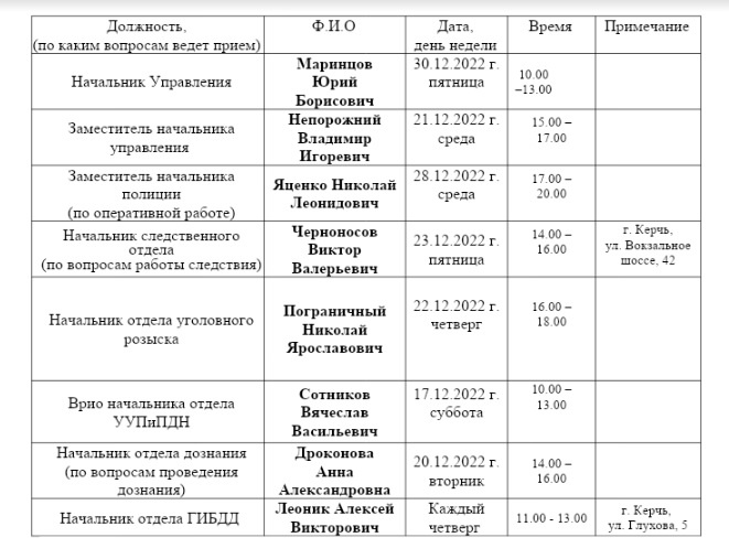 Управление МВД России по г. Керчи информирует о приеме граждан руководящим составом Управления в декабре 2022 года, - передает Керчь.ФМ.