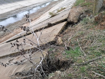 Бетонные одежды канала местами разошлись от основания до бортов. Вода ушла и обнажился реальный объем работ. Это отчетливо видно в месте постоянного мониторинга редакции Керчь.ФМ в районе Семисотки.