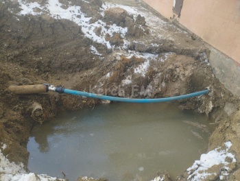 За домом в мороз раскопанный канализационный колодец с трубами наружу. Вроде и воду дали, но как-то не родили этот ремонт до конца, заузили ввод в дом, утеплителем иммитируя толщину трубы.